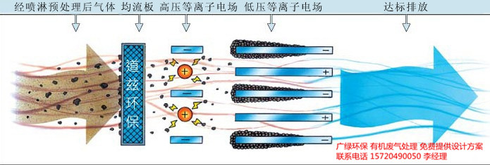 异味气体从气体收集系统收集后,有机废气需要进行预处理,除水后进入等离子体反应区,在高能电子的作用下,使分子受激发,带电粒子或分子间的化学键被打断,同时空气中的水和氧气在高能电子轰击下也会产生OH自由基、活性氧等强氧化性物质,这些强氧化性物质也会与异味分子反应,使其分解,从而促进异味消除 。净化后的气体经排气筒高空排放[